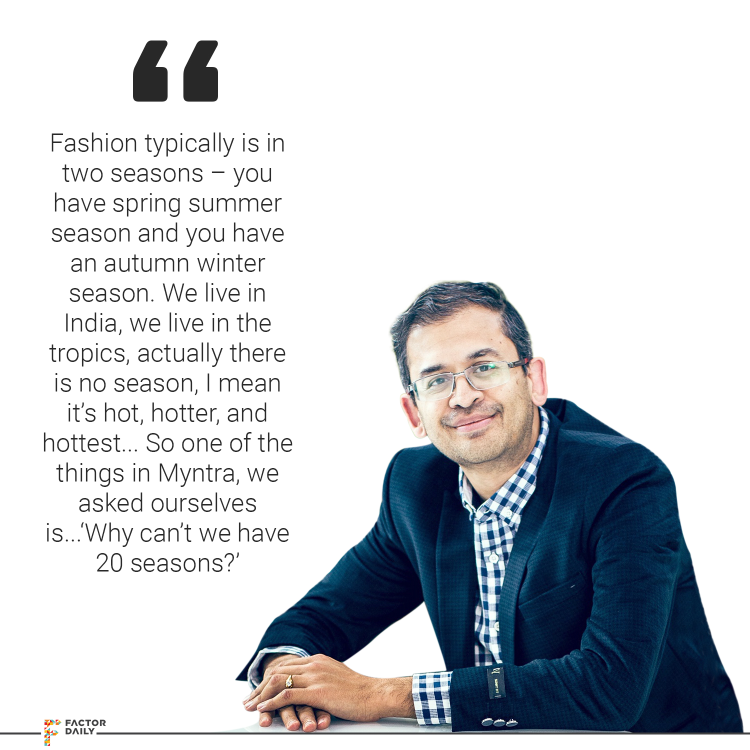 Ananth: So I think there’s benefits to not being from the industry because you tend to think of it differently. I will start with a classic example. Fashion typically is in two seasons – you have spring summer season and you have an autumn winter season. We live in India, we live in the tropics, actually there is no season, I mean it’s hot, hotter, and hottest. There is some variations but it’s mostly summer with a little bit of spring and very little autumn, I don’t know, winter. Yet every buy, how we think of about it, all of the industry operates in these two seasons. So one of the things in Myntra, we asked ourselves is, ‘why do we need to do it that way?’ Right. ‘Why can’t we have 20 seasons?’, ‘why can’t you actually have monthly a different thing that actually comes up?’ So that was one question.