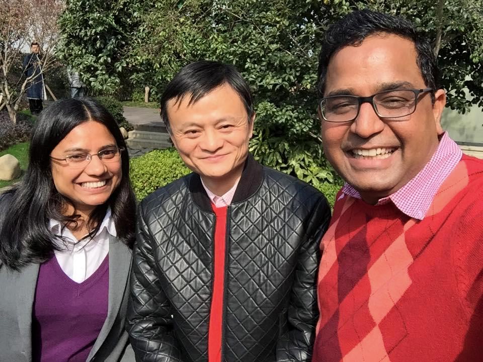 (L-R) Renu Satti, with Jack Ma, founder, Alibaba, and Vijay Shekhar Sharma, founder and CEO, Paytm, in Hanzhou, China. Image: Shekhar’s Facebook account