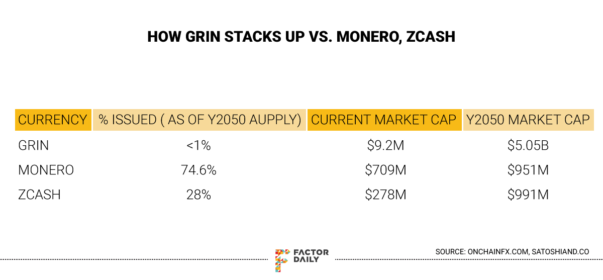 While many investors are actively mining Grin, a number of investors are preferring to wait and watch, given the highly inflationary monetary policy. Given that this is the only game in town in the depths of a bear market with proven, working technology, it is probably fair to expect a pump, perhaps after the Chinese new year but the smart money is probably waiting on the sidelines for a while, given that it is currently valued at ~$4 billion, basis 2050 supply, which is more than the valuation of ZCash and Monero combined. Basis current market cap, however, the valuation for Grin drops to approximately $3.6 million.