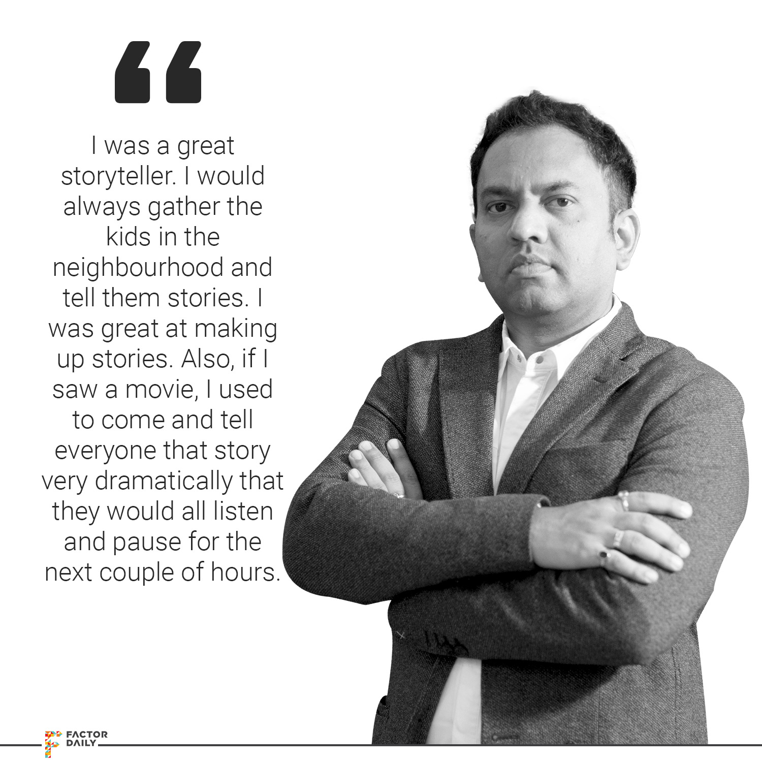I used to be attracted to this area but I was not an artist in terms of drawing or colouring. I was a terrible artist. I used to try, like I used to enter drawing and painting competitions, and every time I used to believe I would win but I never won. Even though I knew that my drawings were below average or let’s say up to an average level, I saw some fabulous drawings by other people who deserved the prize, and I knew that ok, I was far away from being an artist, so I really assessed my talent that I cannot be an artist but I was a great storyteller. Like, I would always gather the kids in the neighbourhood and tell them stories. Sometimes I would just invent the stories and tell. I was great at making up stories. Also, if I saw a movie, I used to come and tell everyone that story very dramatically that they would all listen and pause for the next couple of hours. I used to be able to engage them but I didn’t realize that that I had the strength of storytelling, it was just spending time with friends kind of a thing, summer holidays you know, those days TV was really not the thing. So it started somewhere there but I really had no clue that was what I wanted to do.