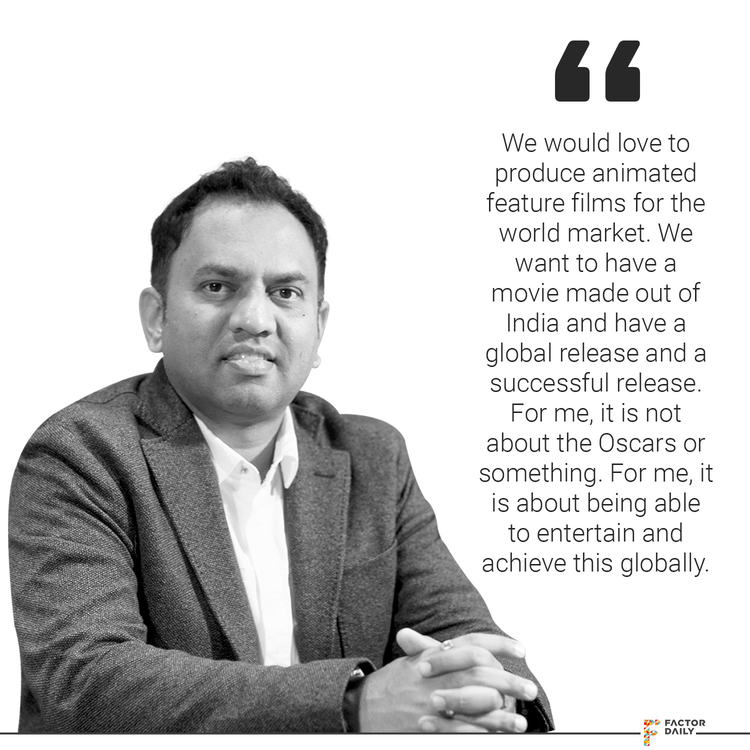 And one of the things market, like how there is a Frozen or Cars3 and so many other movies made either by Disney or Pixar or DreamWorks, made in the US and released worldwide. I think that is a dream for us to achieve that. We want to have a movie made out of India, may be in collaboration with somebody in the beginning, and have a global release and have a successful release. For me, it is not about the Oscars or something. I think for me it is about how people think you are able to entertain and are you able to achieve this globally. I think our shows have done well but to a limited audience, so we want to be able to achieve this globally. And my idol is Walt Disney, so I would like to achieve some of the things that he has achieved, like the theme park and all. It is not easy at all… Indian companies are more known as service companies. I think the time has come for Indian companies. We have the talent, we have the brains, we have the product brain also, we are creating everything, but for others. I think it’s time that we do things for ourselves, work for ourselves, create products. The good thing about India is it’s a self-sufficient market, it is never-ending. So I think we should make India proud.