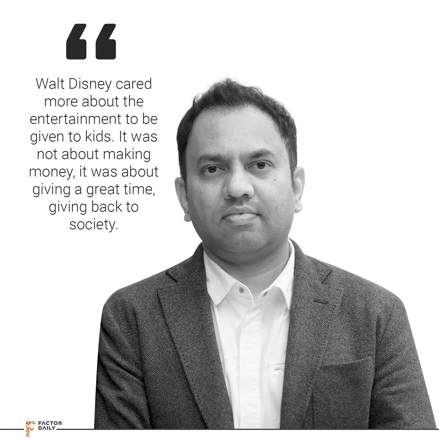 So the next thing immediately was, I was working in my student job, I was working as a librarian, so I was at the library front desk, so somebody dropped a book, and that was ‘The Life of Walt Disney’ in my hand. And then, that caught my attention. I am generally not a person to read books and so something like reading about somebody else’s life, that was something that I had never done, and that was kind of my first book that I completely read with interest. Before I’d read but it wasn’t something seriously. So this guy’s life story, when I read it, I was totally inspired. I felt that whatever he has achieved, even if I am able to achieve 5-10% of that, then I would have achieved something in my life. I think today as a company, Walt Disney is different, but whatever he made, I think that was the true Walt Disney company, where he cared more about that entertainment has to be given to kids. It was not about making money, it was about giving a great time, giving back to society.