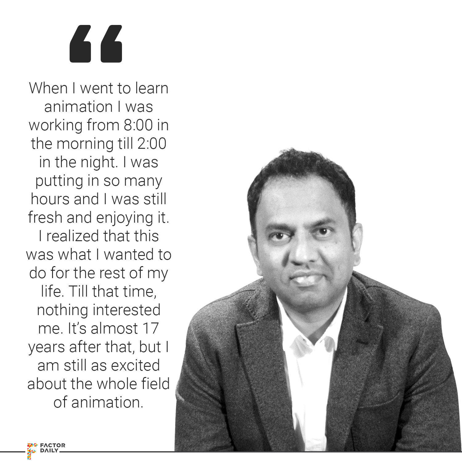 Before that, in my job, in my college, in my school, during my Master’s program, I was a slacker, I would never work hard, I was lazy, I would pretend that I am working in my office just to make sure that people believe that I am working. But I had no interest in work. So when I went to learn animation I realised that I was working from 8:00 in the morning till 2:00 in the night… so many hours I am putting and I am still fresh and I am enjoying it, I am so excited about it. I kind of realised that this is what I want to do for the rest of my life. I mean, till that time, nothing interested me and it’s almost like now, 17 years after that, but I am still equally excited about the whole field of animation and arts and this thing.