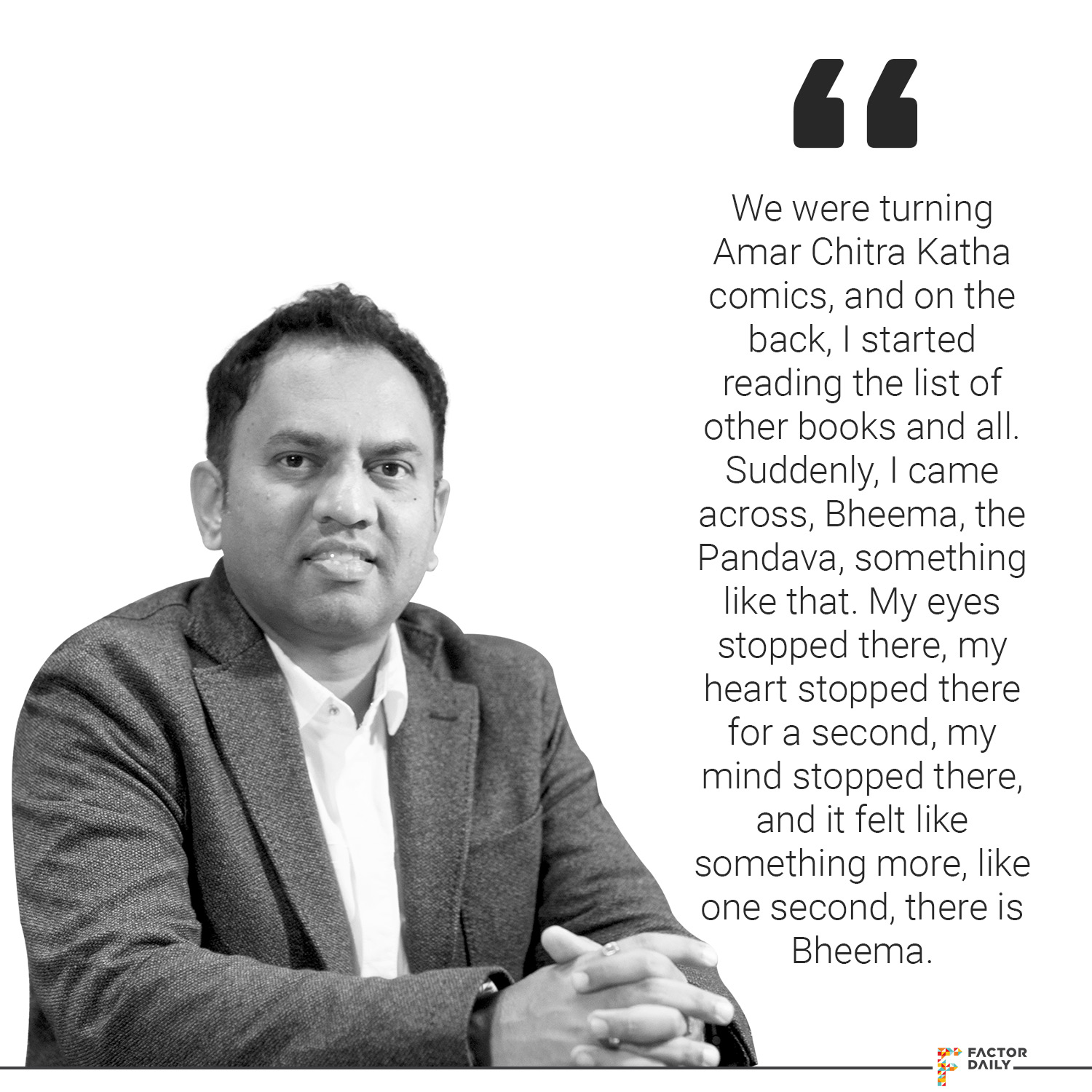 The same night I sat figuring out with my partner. Samir was sitting across my table. We were turning Amar Chitra Katha comics, then I started reading some lists of Amar Chitra Katha, you know, back of Amar Chitra Katha, the list of names of the books and all. I was looking and suddenly I ran across, Bheema, the Pandava, something like that. My eyes stopped there, my heart stopped there for a second, my mind stopped there, and it felt like something more, like one second, there is Bheema. Bheem was also my favourite character growing up, so I kind of stopped at that and then I said, “Ok, how about we make Bheem?” And then I started thinking aloud that there is Bheem and then there is Arjun in Mahabharat, then Shakuni and Drithrastra, and unlimited characters, and no, no, no, Bheem doesn’t make sense because then again he is growing up, same problem, our people will kill me. Vikram aur Betaal is still better.