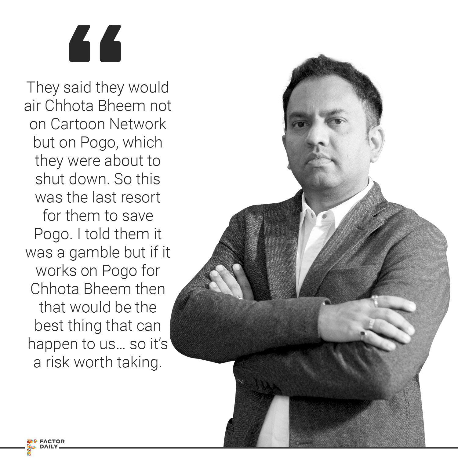 Rajiv: Yes, others were also there. Disney was there. I mean, few years back only. We also went to everyone, Disney, Hungama. Everyone rejected Chhota Bheem. So the last attempt we made again to Turners, that “this is the best show ever, trust me, you’ll not regret.” So they kind of heard me out because I already was working with them, so we signed a deal. But then, little bit of a bomb they put on me, that, “Ok, we are going to put Chhota Bheem not on Cartoon Network but on a channel called Pogo.” They were about to shut down the channel, so this was the last resort for them to save Pogo. So they asked me, “Are you ok with it?” I said, “I know irrespective of what I say, you will do what you have to do.” And I told them the exact words: “This is a gamble but if it works on Pogo for Bheem then Pogo will become the face of the channel and that is the best thing that can happen to us… so I think it’s a risk worth taking, I have no objections to it.”