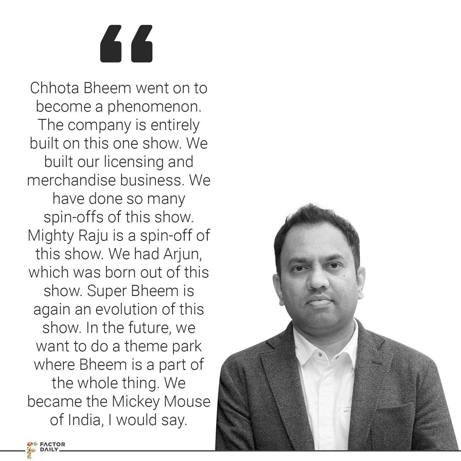 Rajiv: As per our research and some articles on the net, it looks like about 73% of Indian kids follow Chhota Bheem. More during its peak than now, but pretty much every kid has grown up at some point or a few months to a few years, they have grown up on Chhota Bheem. Which turns out to be, TV audience-wise, about 40 million-plus viewers. The best thing that Bheem has achieved is, it has got equal success in Kerala or Andhra or Telangana or Madhya Pradesh or Uttar Pradesh or West Bengal or North East or Kashmir or Bangladesh or Pakistan or Nepal, all these countries which have a similar thing. Even in Indonesia, it’s become a phenomenon, it did extremely well. Animation, obviously, is universal and I felt very proud that, although everybody saw initially at this as a Hindu character, it was just a kid and went on explaining to people that this has got nothing about God, it’s just a story of a kid. He wears a dhoti, I have given that dhoti just to have, you know a colour to the kid, and be different about wearing, so the animated character wears yellow or so many other colours and nobody has done that, so let me do that. So it kind of had initial, little bit of issues but Bheem, viewership-wise, I think that it still continues to be in the top 2-3 shows even today after 10 years. Our new show, Super Bheem, is also doing very well and we are excited about this series. In the future, we want to do a theme park where Bheem is also a part of the whole thing. That is some five years away at least, but overall, I think the entire foundation of the company is made out of Chhota Bheem.