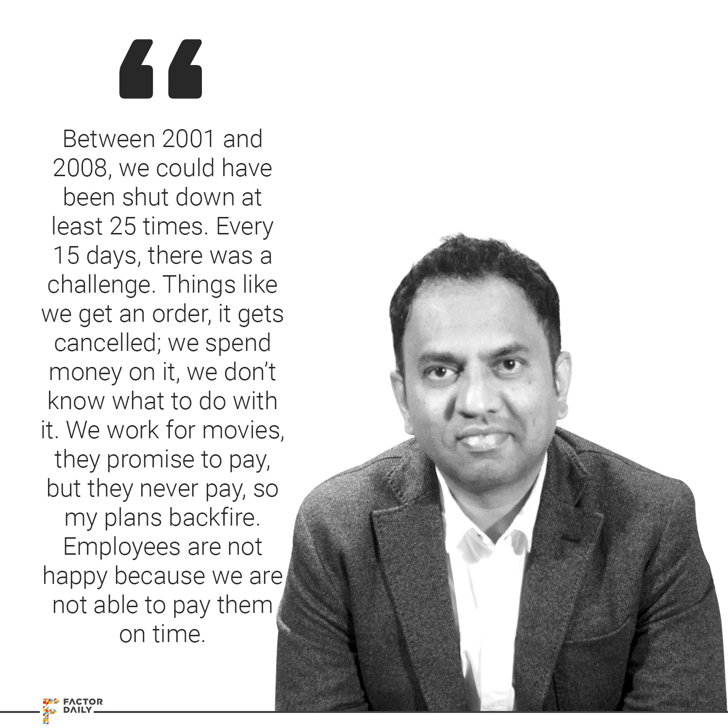 Rajiv: I learnt a bunch of software, animation and stuff, but I realised that nobody has a background in animation here. Animation was just a new thing. There was Pentamedia, Color Chips and a few companies like that who went public, and they were doing fantastic, and there was a story back then and we had something at least to look up to. So there was some hope. So, initially, I realised that we didn’t have the people to run what I wanted to do. So we had to start training people. So we started with 4-5 people, started training them. At the same time, these guys were having multimedia experience, they were more multimedia guys than animators or anything. So we started doing this thing and started working for corporations, like started doing small jobs for software companies. So we started doing services for them, you know, designing their websites, doing some logos or their visiting cards or brochures. Basically, we didn’t restrict ourselves from doing anything. We made corporate films. In fact, I was the writer, cameraman, one-man army kind of thing. So when I came back, I bought a digital camera which nobody had in Hyderabad that time. So I kind of made myself look very tech savvy, so that everybody was impressed. So it was easy and I always priced things right, because I knew that my interest was only to survive the month, pay the bills. I understood what my clients wanted and I saved them money, so they never left me. Because they knew that no matter who they go to, I will give them the best quality as well as the best price. So that kind of worked in my favour and I did that and that is my policy, as long as you are making some money on it, I think you should not overprice yourself.