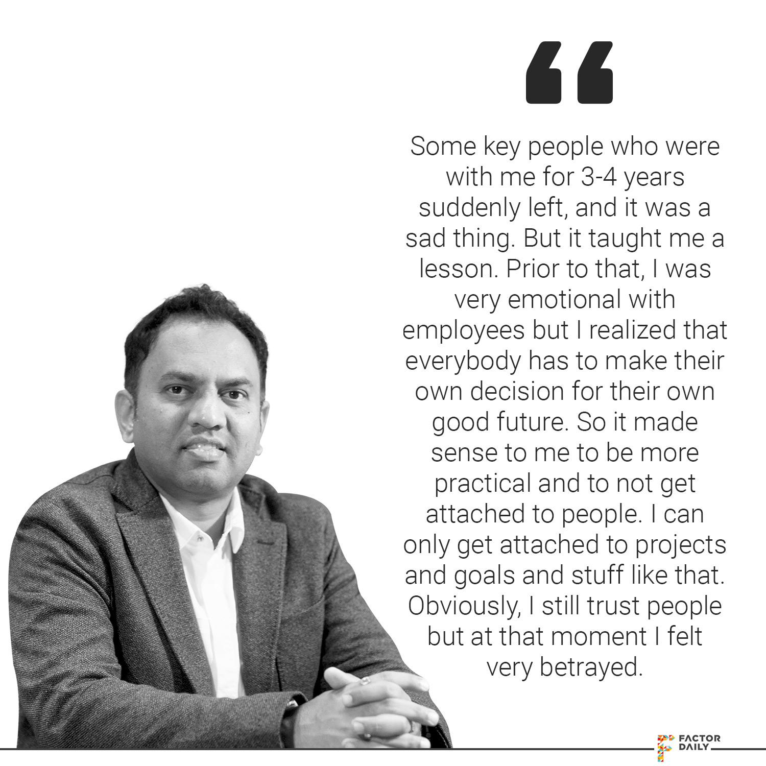 So fair enough. Obviously, anybody who saw that would have been scared. Luckily, there were no people living there, so no files or hard disc or anything was lost. But this was a moment where I felt like, how much ever I am putting effort, how much I am facing, there are so many hurdles, I cannot take it anymore. I had that kind of a moment, now this is enough, now this is where I quit. I felt that for about 15 minutes, then I went and had a beer and then I was ok. I wanted to keep going. So one of the offers that one of the guys told me was go back to this old office, reduce the team size and start again. I said, “Listen, I don’t think I want to move backwards because I believe in moving forward and I don’t see this as anybody’s fault. It happened! But we have an order, we are doing great, we shouldn’t be conservative. This is a time to take bigger risks. So one of the challenges was to pay all these guys first thing. And then they had to supply me all the material again. So I called all of them one time, before they could hear from every other source, I called them to the office, I showed them what happened. I said, “Listen guys, now this has happened, I know I have to pay you guys. I will pay you as soon as I have, within three months, I promise you. I need a favour from you all. No, not only will the payment be delayed or what you pay now, you have to pay supply everything that you supplied to me again, and I will take another three more months to pay that money.” And I thought they will trash me then but interestingly, they were all ok with that.