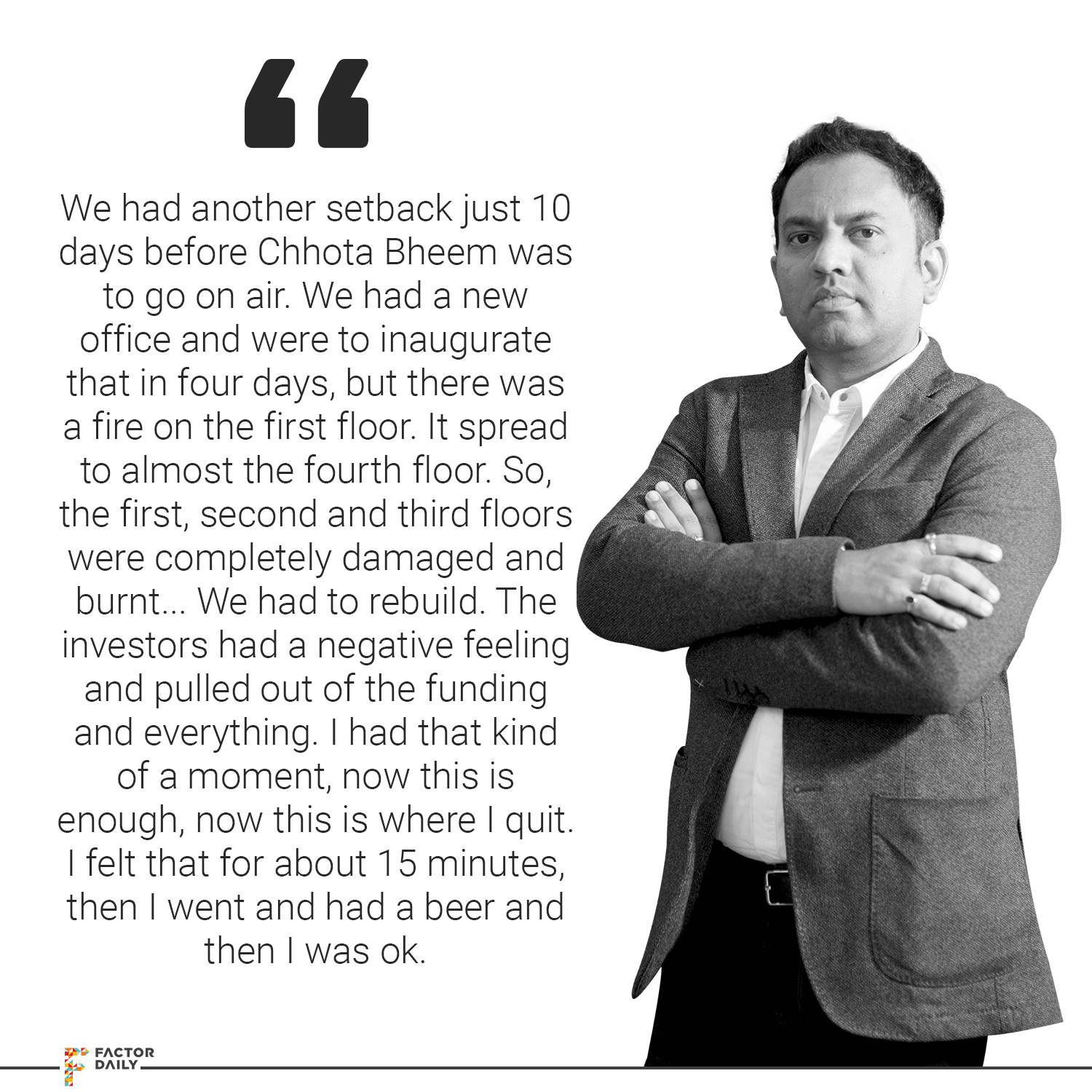 Few more times, like, you know, after some time Samir developed cold feet. He had his health problems, he couldn’t fund any more, we were out of funds. So 3-4 months were terrible times and then I stopped working on the other clients. So I had to go and again ask for work, re-start it. In the meantime, we had started getting some orders. We had already started getting names in the circle. Then one company came, PMI, they came for the help, so they saved us again from a shutdown. Another setback was just 10 days before Chhota Bheem went on air. We had built a new office. We had brand new interiors, we were inaugurating that office in four days, and there was a fire on the first floor. A short circuit or something happened on a Saturday night. From the first floor the fire spread to almost the fourth floor. So, the first, second and third floors were completely damaged and burnt… We had to rebuild. Unfortunately, the PMI investors were coming to decide whether they wanted to invest in Chhota Bheem or not. I told them what had happened and it was all over the newspaper and news and stuff. I took them to the site. They obviously had a negative feeling, they pulled out of the funding and everything.