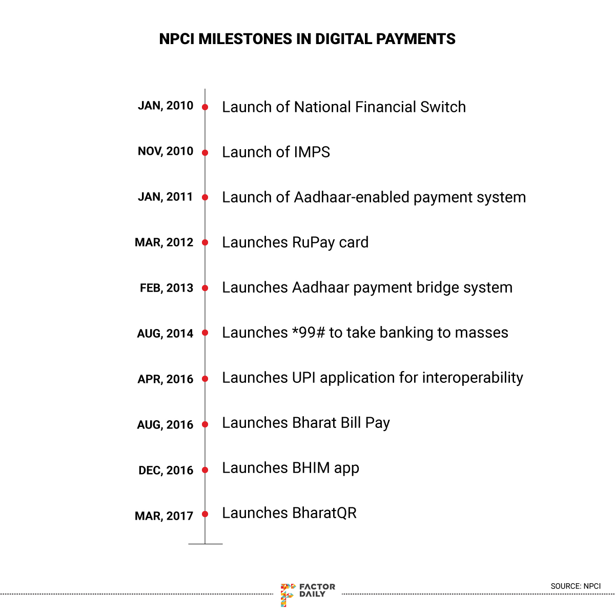 The NPCI is a not for profit organisation for retail payments in India formed by a set of public and private banks to improve the payments and settlement infrastructure in India. The organisation operates payments infrastructure such as National Financial Switch (NFS), the largest network of shared ATMs in India, Cheque Truncation System, RuPay (a card payment system like Visa and MasterCard), the Aadhaar Enabled Payment System and so on. The UPI was launched in April 2016, mostly to make small transactions faster.