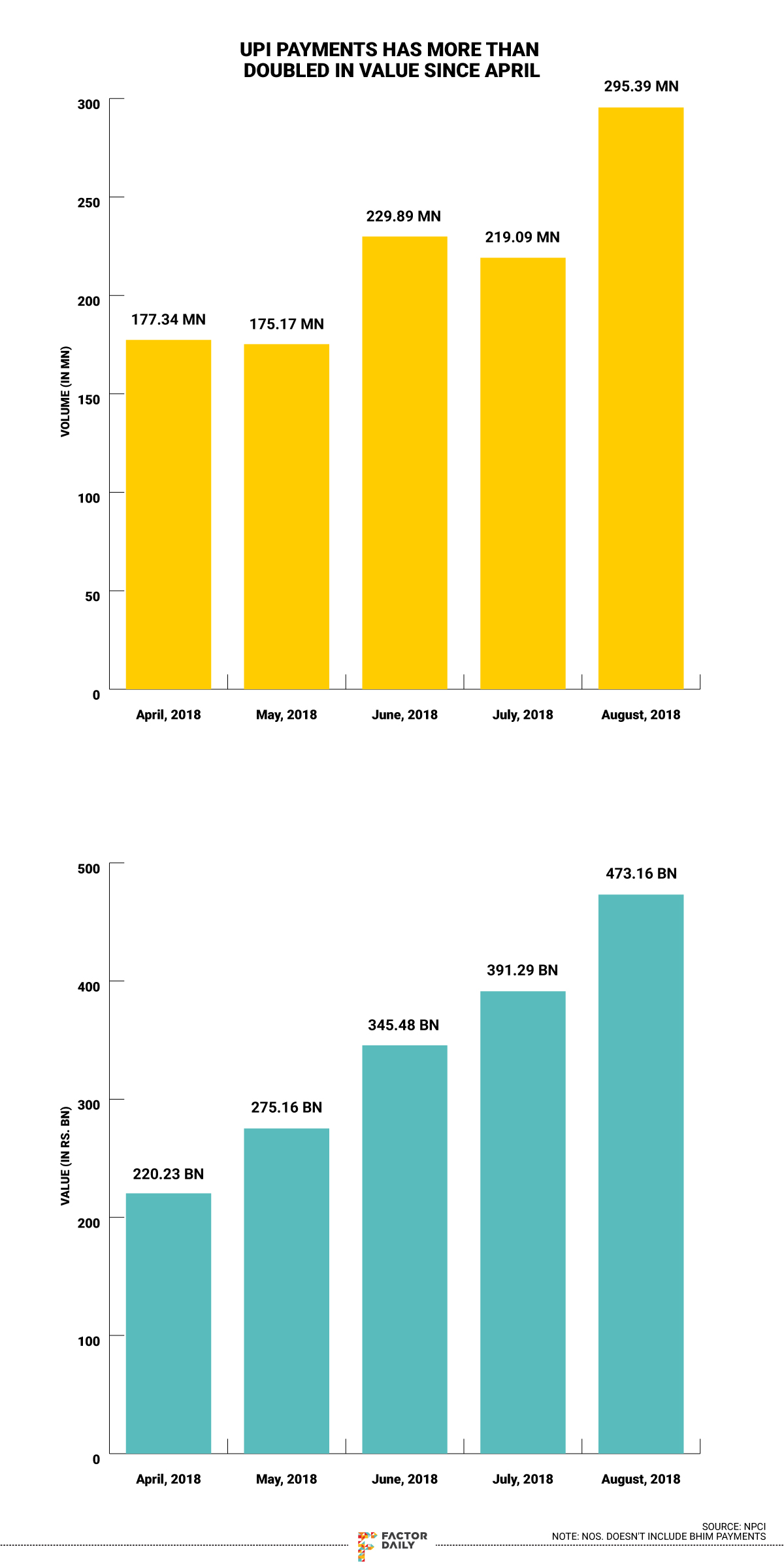 In 2017-18, UPI transactions totaled up to 915.23 million worth Rs 1,09,832 crore. In the first five months of 2018-19, already 1,096.88 million UPI transactions have been recorded worth Rs. 1,70,532 crore. With the number of transactions in September topping 400 million, the volume of UPI-based payments has overtaken that on all other proprietary mobile wallets.
