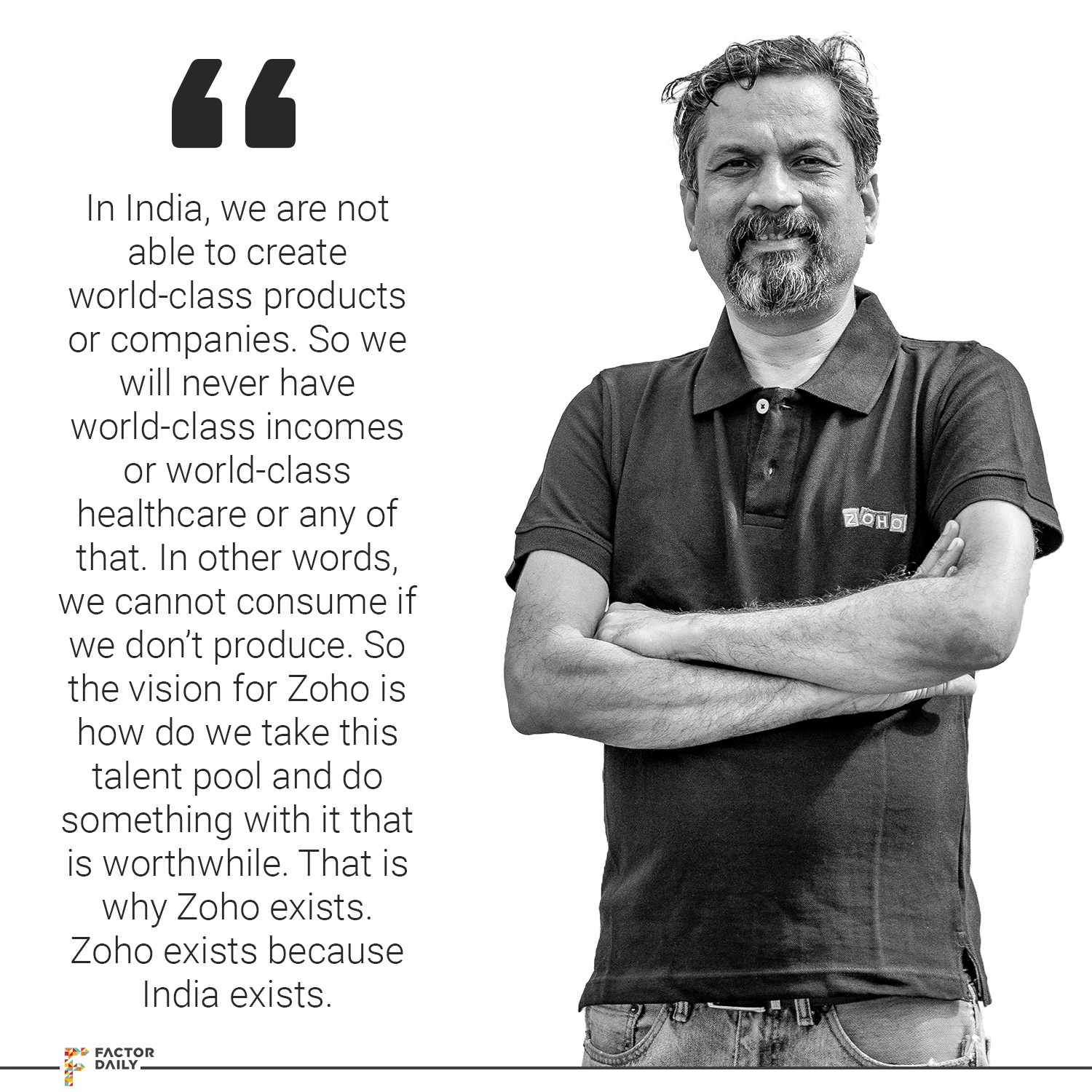 Sridhar: Actually, almost from the early days, Zoho exists because in a way India exists. Meaning, I have always said that if I were born in a different country, in a different circumstance, I may not have been even an entrepreneur. That’s possible. Actually, I wanted to become a professor, I wanted to teach, I wanted to do research, I wanted to publish papers. It was my dream. But in a way, growing up here, you grow up and you are surrounded by what you see. At some point, I would engage or ask, ‘Why are we so poor?’ And then, I figured out that the answer is, you have to be building a lot of things in order to escape poverty. Then, I am the type of person who says, ‘Well, you can’t say that other people should be doing it. What am I doing about it?’ Then I said, ‘Ok, we have to be doing this then.’ Then I set aside my interest in publishing papers or doing research and said, ‘Let me jump into this.’