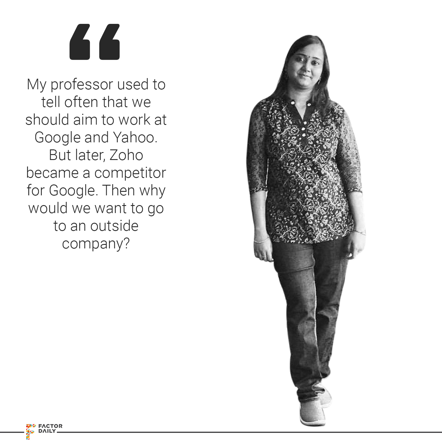 Revathy: Yes, my professor used to tell this often, you should aim to work in Google and Yahoo, something like that, and later the stage has been developed like, Zoho has become a competitor company for Google, then why would we want to go to an outside company?