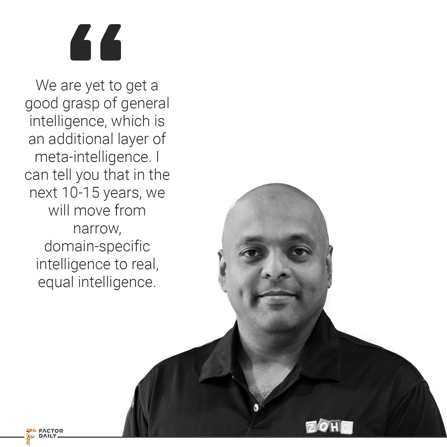 What we are yet to get a good grasp of is this concept of general intelligence which is can an additional layer of Meta intelligence be programmed that will identify which domain to get into and what kind of special intelligence to trigger? Today you can give a neural network, 10 million games of chess and it will learn the rules of chess and defeat you in chess. Amazing! But what if I don’t tell you it’s even a game? What if I don’t tell you it’s played in 64 squares? Can that Meta layer of intelligence be programmed? So I, with my own limited knowledge of crystal balls, I can tell you that in the next 10-15 years, we will move from narrow, domain-specific intelligences to a real, equal intelligence.