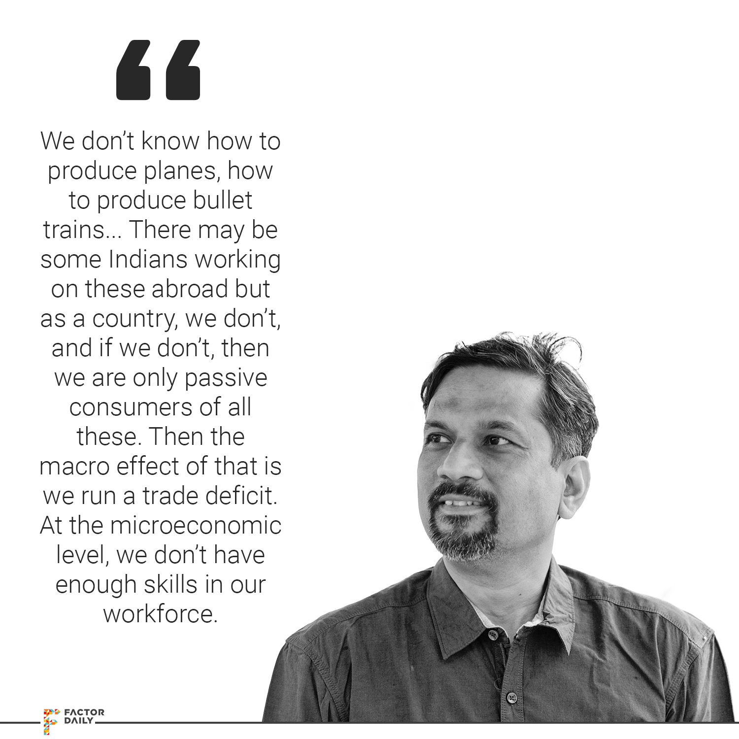 We don’t know how to produce planes, I mean, I am talking about commercial aircraft. We don’t know how to produce bullet trains, we don’t know how to produce even ultrasound yet. There may be some Indians working on these projects abroad but as a country, we don’t, and if we don’t, then we are only passive consumers of all these. Then the macro effect of that is we run a trade deficit. But at the microeconomic level, we don’t have enough skills in our workforce. We don’t have enough skills because we are exporting the people to get those skills and, therefore, the skills don’t deepen here under the newer generation gaining those skills. We don’t have enough people who train in those skills. Just simply saying, ‘we have colleges’ is not enough because you cannot teach a person how to build an MRI machine in a college, you have to learn by doing it. There are some core concepts, physics, all of that, but ultimately it has to come from the deeper process of doing it. And we have not created enough such companies here.