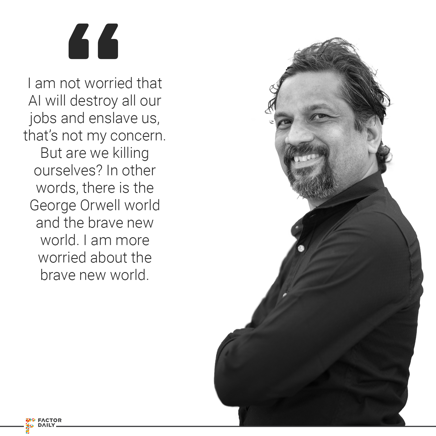 I am not worried that AI will destroy all our jobs and enslave us, that’s not my concern. But are we killing ourselves? In other words, there is the George Orwell world and the brave new world. I am more worried about the brave new world because we are heading to a brave new world. I am worried about the brave new world but we are drugged into some kind of a stupa.