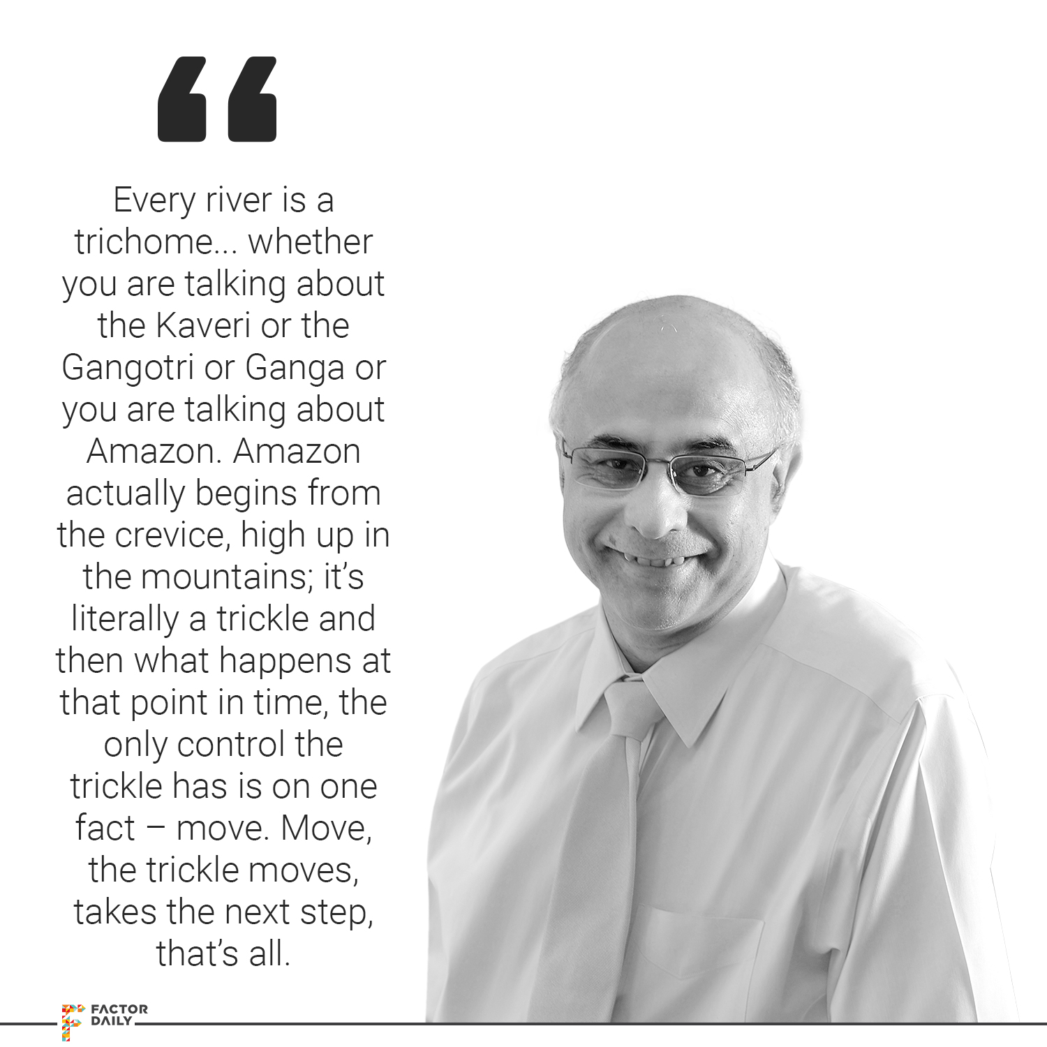 Subroto: That’s all. That’s all there is to it. And then what happens is, as it goes along, another completely unknown entity joins the journey. So, just as you would know, Amazon is actually the coming together of two rivers. It is the Amazon and then it is the black Amazon and at that point when a complete stranger joins them, the river doesn’t reject that. The river does not look for familiarity, river doesn’t ask for assurances and takes the other tributary along and together they become more expansive. And then they flow out. As they flow, suddenly there is a huge mountain in front of the river. The river doesn’t agonize with the fact that’s suddenly there is a mountain in front of you, it doesn’t fight the mountain, it just skirts the mountain and flows on.