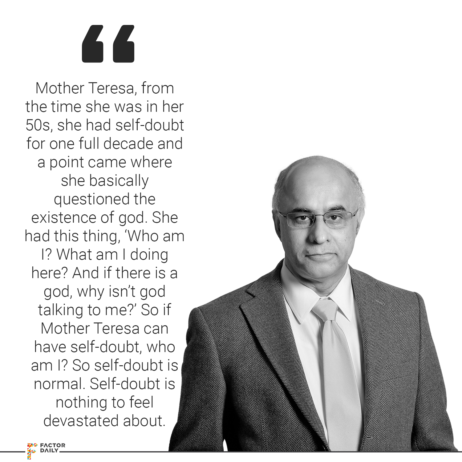 Now come back, the whole idea of resilience and talk about the issue of self-doubt particularly in the post 30s age… I must tell you two things. One is, you know, you very unkindly told the listeners that I am going to be 60 and I must tell you that in all my life, there hasn’t been a day that I didn’t have self-doubt. My mornings start with self-doubt, my evenings end with joy. And, I am not alone, there are greater people who have walked the path who have had self-doubt. Mother Teresa, from the time she was in her 50s, she had self-doubt for one full decade and a point came where she basically questioned the existence of god. That’s the big reason why her beatification took so long. She had this thing, ‘Who am I? What am I doing here? And if there is a god, why isn’t god talking to me?’ So if Mother Teresa can have self-doubt, who am I? So self-doubt is normal. Self-doubt is nothing to feel devastated about. Self-doubt is a starting point of humility, self-doubt is an instrument for deflection.