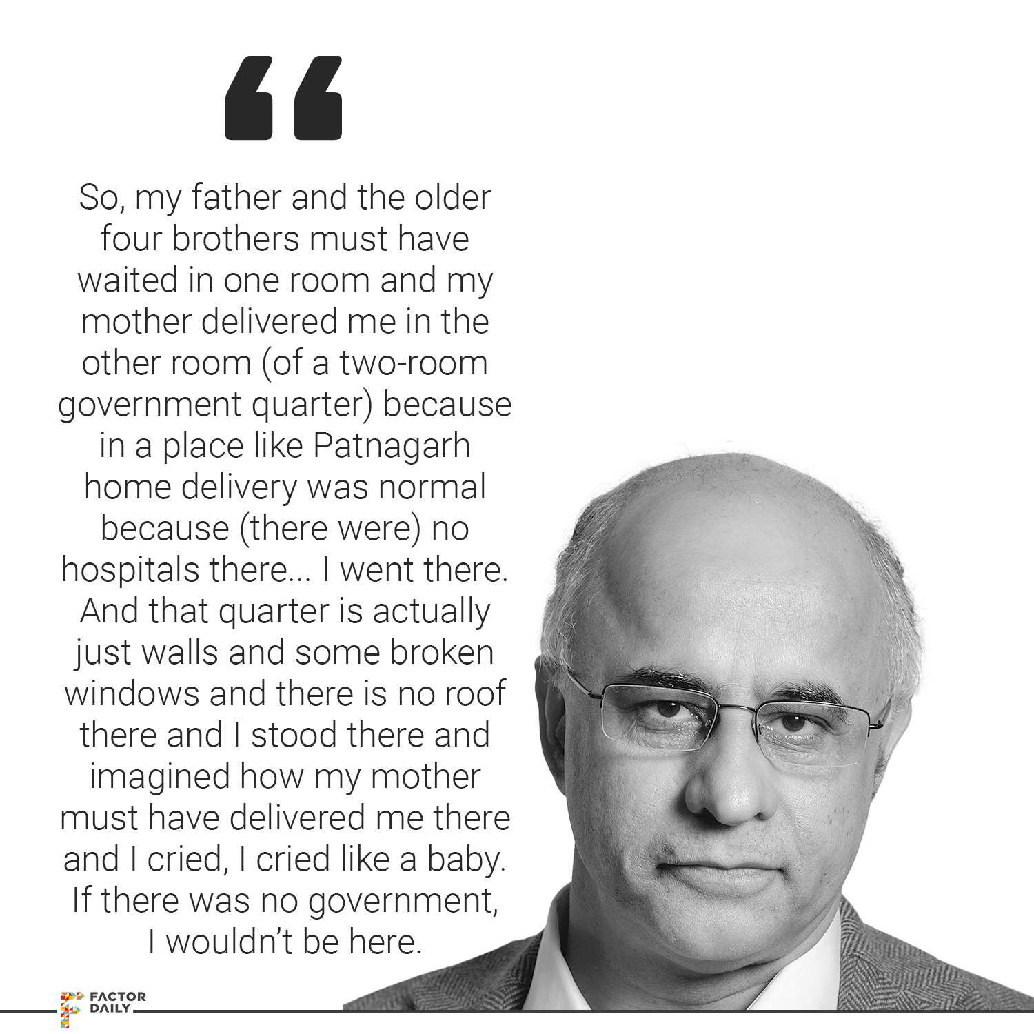 Subroto: Yes, it’s a two-room house, two-room government quarter, I keep saying house I don’t know why. Two-room government quarter… So, my father and the older four brothers must have waited in one room and my mother delivered me in the other room because in a place like Patnagarh, home delivery was normal because (there were) no hospitals there. There is no electricity, no running water and so no hospital, no running water, no electricity, mother gave birth there, I went there. And that quarter is actually just walls and some broken windows and there is no roof there and I stood there and imagined how my mother must have delivered me there and I cried, I cried like a baby. If there was no government, I wouldn’t be here and from then on, I actually grew up in government quarters. My father was a small-time government servant who went from place to place every 12-18 months, we’d move from one place to the other. So my father raised us, five brothers, on a government job, on a government salary. We grew up in government quarters.