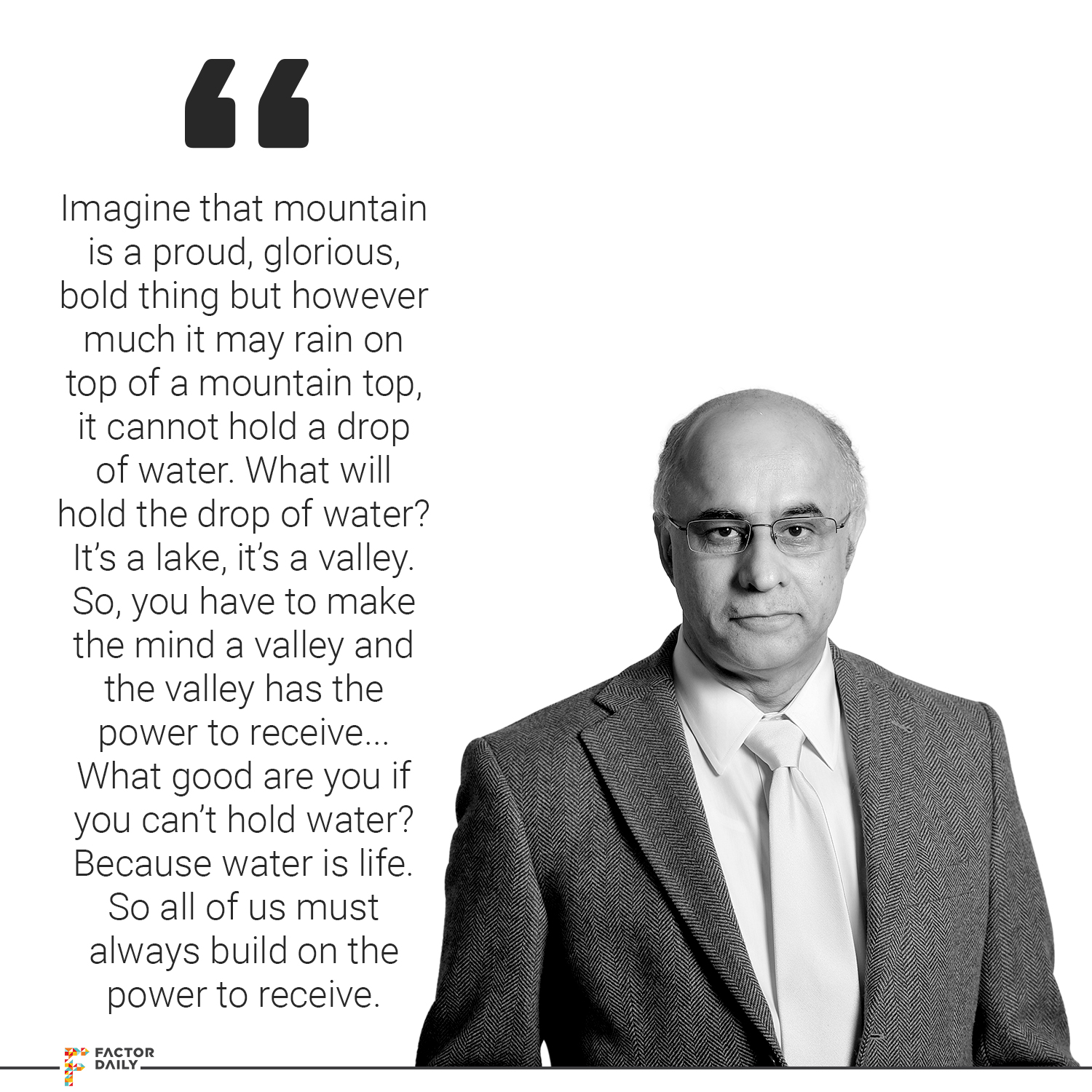 So, people who will make a difference in life would have instilled in them the power to receive and I go back to what I learnt during my days in Wipro. Azim Premji sent me to Japan to learn about Total Quality Management and one of the TQM gurus’ there told me, you know Japanese are very fond of the mountain as a metaphor, yes everything. So, I say, imagine that mountain is a proud, glorious, bold thing but however much it may rain on top of a mountaintop, it cannot hold a drop of water. What will hold the drop of water? It’s a lake, it’s a valley. So, you have to make the mind a valley and the valley has the power to receive, the mountaintop with all its pride and masculinity doesn’t have power to receive, so it will not hold water. What good are you if you can’t hold water? Because water is life. So all of us must always build on the power to receive.