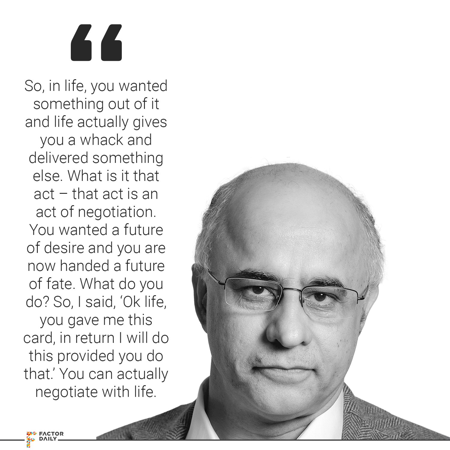 So, in life, you wanted something out of it and life actually gives you a whack and delivered something else. What is it that act – that act is an act of negotiation. You wanted a future of desire and you are now handed a future of fate. What do you do? So, the question is, if I know that actually… we are, me and life are at a negotiating table. So, I said, ‘Ok life, you gave me this card, in return I will do this provided you do that.’ You can actually negotiate with life. The moment you do that, the moment you say, ‘Ok, the future of fate. Now can I convert that future of fate into future of desire?’ What desire can I build on that fate? So I had a future of desire and that future never happened, so be it. Now, you give me a future of fate but it’s not a fate with a capital F. Life is fooling with you, you know, life is playing with you. So, now, I need to negotiate with life. Life, wife, boss, whatever it is and can I within that create a future of desire, all over again? So, I think it is very important to recognize that it is a negotiation, you can’t moan the fact that things today morning didn’t go the way you wanted it. Your customers’ sprang a surprise at you. You wrote an agreement, the agreement looked like it is written in stone and then the customer comes back and says, ‘No fundamentals have changed from prison power and now jobs must come back to the US and I need to insource.’ You can’t then say, ‘So this is the beginning of the end.’ You need to be constantly at the negotiation table and say that something good is going to come out of it. It changes. It changes your mindset. You suddenly are filled with positive energy and you are no longer playing from a position of disadvantage.