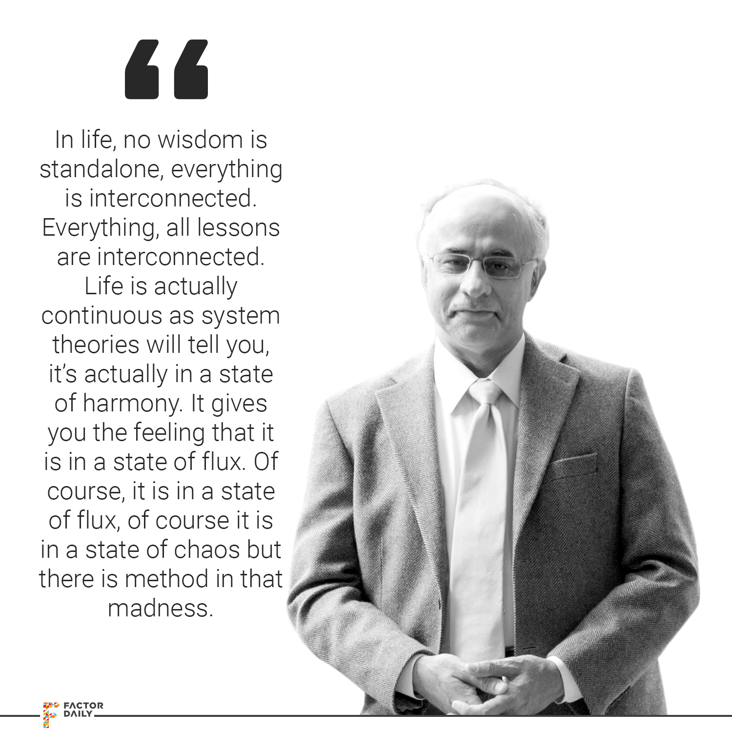 Subroto: Yes. That’s a beautiful point you made. Actually, in life, no wisdom is standalone, everything is interconnected. Everything, all lessons are interconnected. Life is actually continuous as system theories will tell you, it’s actually in a state of harmony. It gives you the feeling that it is in a state of flux. Of course, it is in a state of flux, of course, it is in a state of chaos but there is method in that madness. Everything is connected to everything.