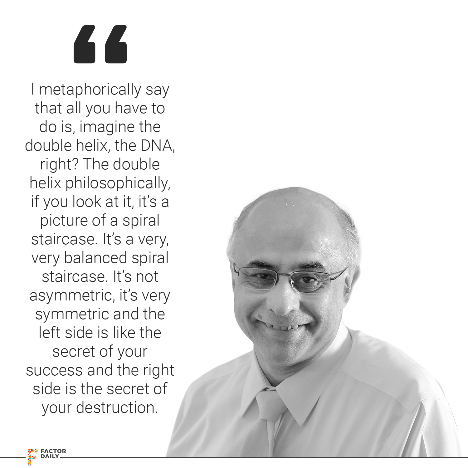 Subroto: Yes, you have some names. We have names. I am sure that some of the names are common. Everywhere. So, you know, I metaphorically say that all you have to do is, imagine the double helix, the DNA, right? The double helix philosophically, if you look at it, it’s a picture of a spiral staircase. It’s a very, very balanced spiral staircase. It’s not asymmetric, it’s very symmetric and the left side is like the secret of your success and the right side is the secret of your destruction. You need to be very self-aware of that fact. Only when you are very self-aware and you recognise at every step that you can deflect your achievement and you can have the humility and the power to receive inputs, that’ll actually postpone your destruction because, ultimately, you know, if you have survived everything then death will take you, even if taxes spare you, Trump spares you, death will take you.