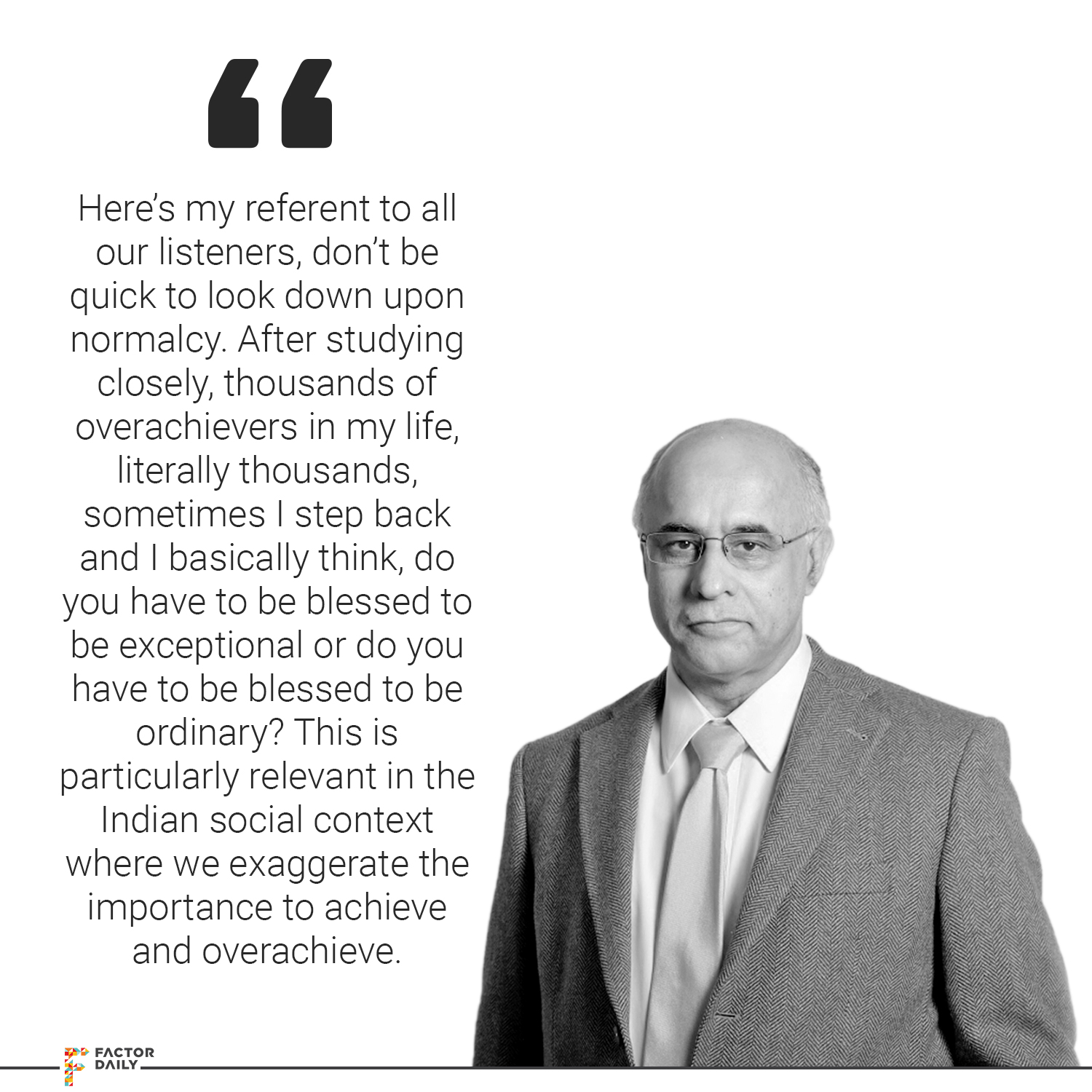 Subroto: So, here’s my referent to all our listeners, don’t be quick to look down upon normalcy. After studying closely, thousands of overachievers in my life, literally thousands, sometimes I step back and I basically think, do you have to be blessed to be exceptional or do you have to be blessed to be ordinary? This is particularly relevant in the Indian social context where we exaggerate the importance to achieve and overachieve. We eulogise, we put overachievement at a platform and we as a society, we blank out, you know the collateral damage of overachievement, both on the overachiever as well as on the system. So, sometimes, I feel, you don’t need to be blessed to be an overachiever; in many cases, it is a curse actually, going back to the double helix, if you don’t manage that very carefully. You need to be very blessed, yeah, at the close of your life, you need to be blessed to be ordinary and sometimes it is more important to be ordinary. You know, if your victory, for many of us the victory is by walking on dead bodies. Now, is that victory worth it? So, overachievement is an overrated thing but nonetheless stepping back, the lesson is the overachiever is her best friend and worst enemy.