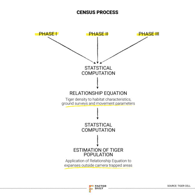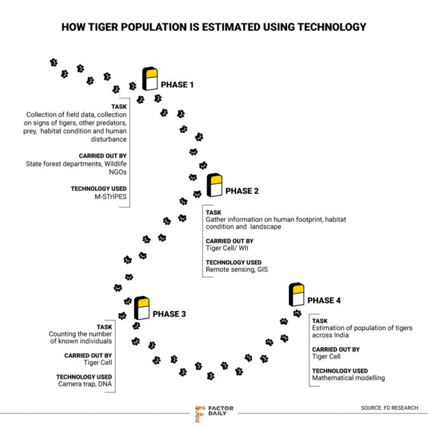 In Phase 1 of the estimation, forest departments collect data on signs of tigers, preys, other predators, and human impact, using M-STrIPES. Once the field data is in, the Tiger Cell knows where tigers are present.
