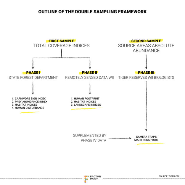The task force chose a system proposed by Jhala and Qureshi, by borrowing from what was published by different scientists on methods of population abundance estimation. This was an improvement over the existing pugmark technique. It recorded ecological signs of tigers, co-predators, and prey. It used camera traps and with the support of geographical information systems (GIS). And it enabled population estimation across vast landscapes.