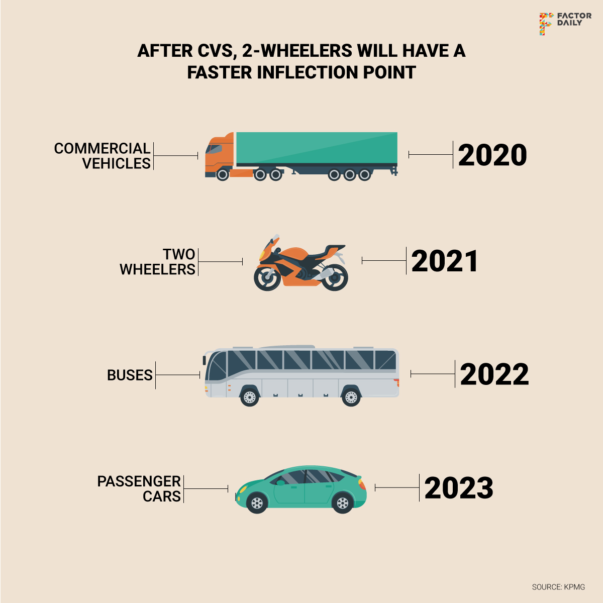 Niti Aayog in a May 2017 report, mentioned that two-wheelers – both private and fleet – will have a quicker adoption of electric mobility. Consultancy KPMG suggests that electric two-wheelers’ adoption will precede that of buses and cars.