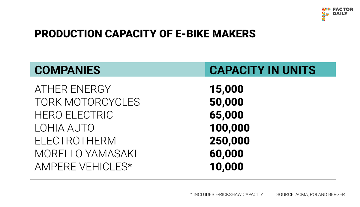Let’s look at the demand. The ACMA-Roland Berger report mentions that by 2025 – seven years from now – 34.5% of total two-wheelers can potentially be electric. That number is about 11.6 million vehicles. But, does India have the capacity? “Production capacity would be the major limiting factor for EV penetration in two-wheeler segment,” the report says.