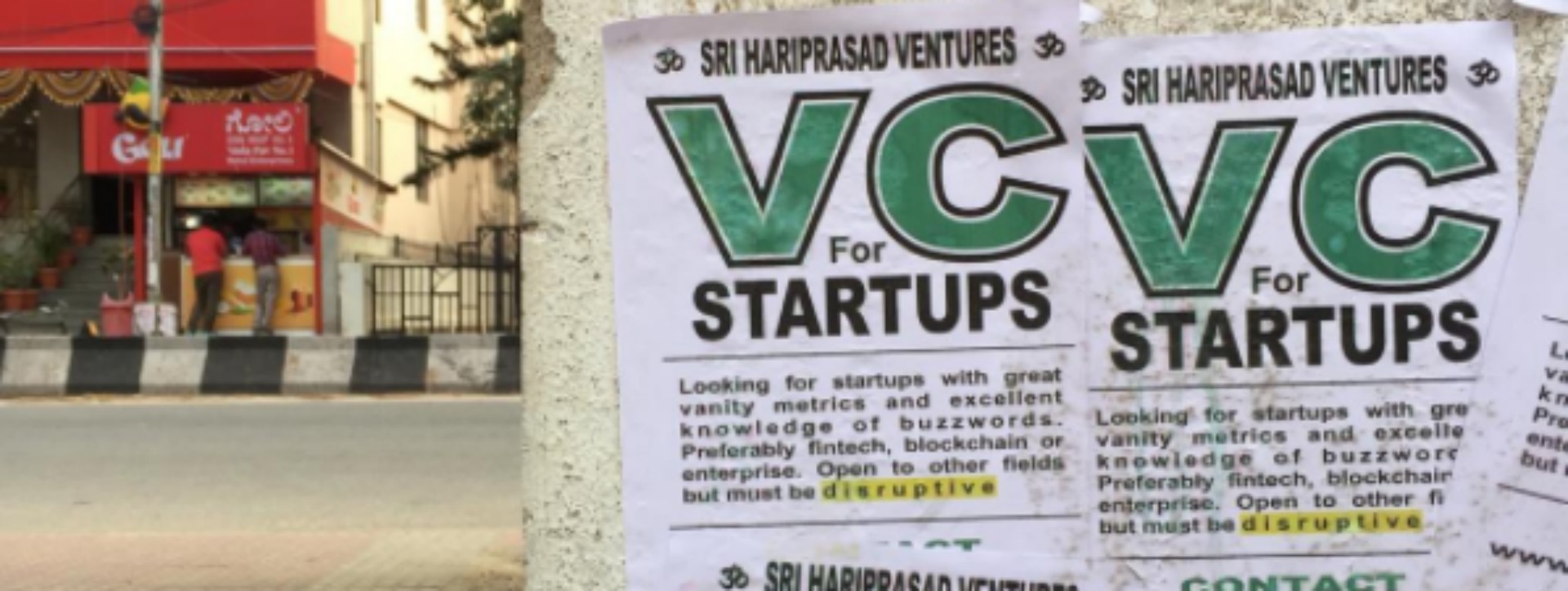 Around four days ago, a bunch of lurid green and white posters came up almost overnight on walls and pillars around Bangalore’s Koramangala area, which many consider the most active startup hub in India. The posters purported to be from an entity called Sri Hariprasad Ventures, which advertised itself, unequivocally and seemingly without irony, as a “VC for Startups” in big, bold letters. The posters also claimed that Sri Hariprasad Ventures was “looking for startups with great vanity metrics and excellent knowledge of buzzwords. Preferably fintech, blockchain, or enterprise. Open to other fields but must be disruptive.”