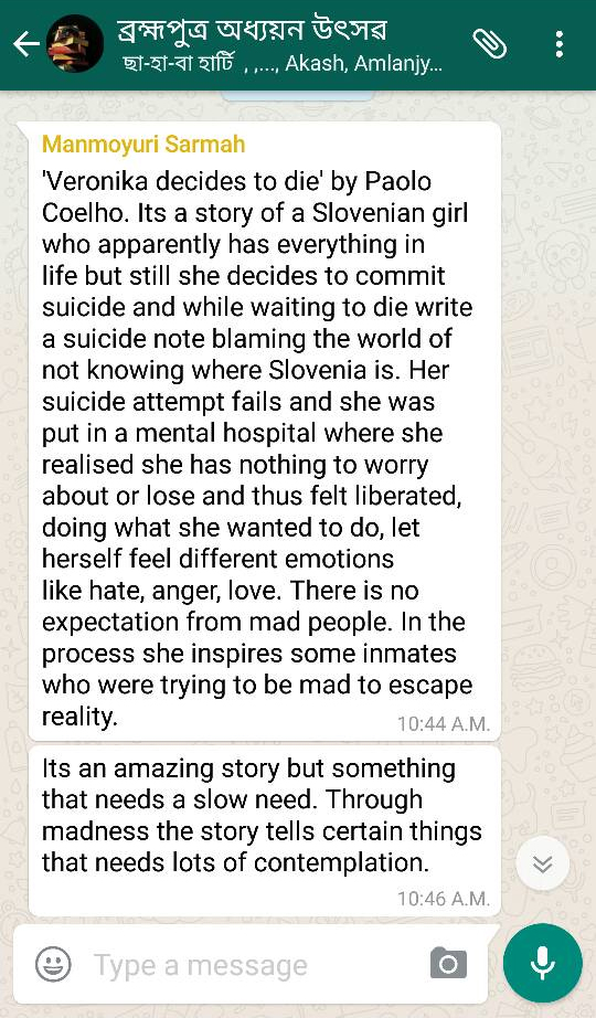 Aware of their positive impact on society, the literary members of the group have started another WhatsApp group, Brahmaputra Adhyan Utsav, to discuss literature and encourage aspiring writers. Noted Assamese writer Manikuntala Bhattacharjee has also joined the group.