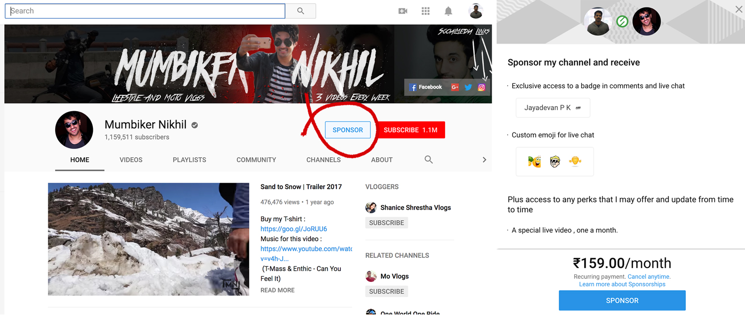 The other big move for YouTube in India will be the ‘sponsor’ button, which is currently being tested with a select set of creators. Users will be able to pay creators by giving them Rs 159 per month. We spotted the sponsor button on Mumbiker Nikhil’s channel. “The feature will be rolled out to a lot more creators this year,” said the source.